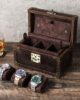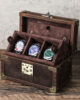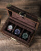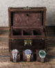 Crafted from high-quality coffee-colored crazy horse leather, this watch case features a timeless and classic look that ages beautifully. Enhanced with metal rivet details and a unique leaf-shaped metal buckle closure for security and style. Includes a 3-slot detachable velvet tray with soft dividers to protect watches from scratches. Offers customizable storage options and is part of an exclusive series catering to various collector needs.